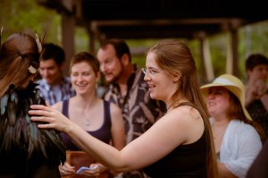 The wedding party mingles. In particular, folks are impressed wi