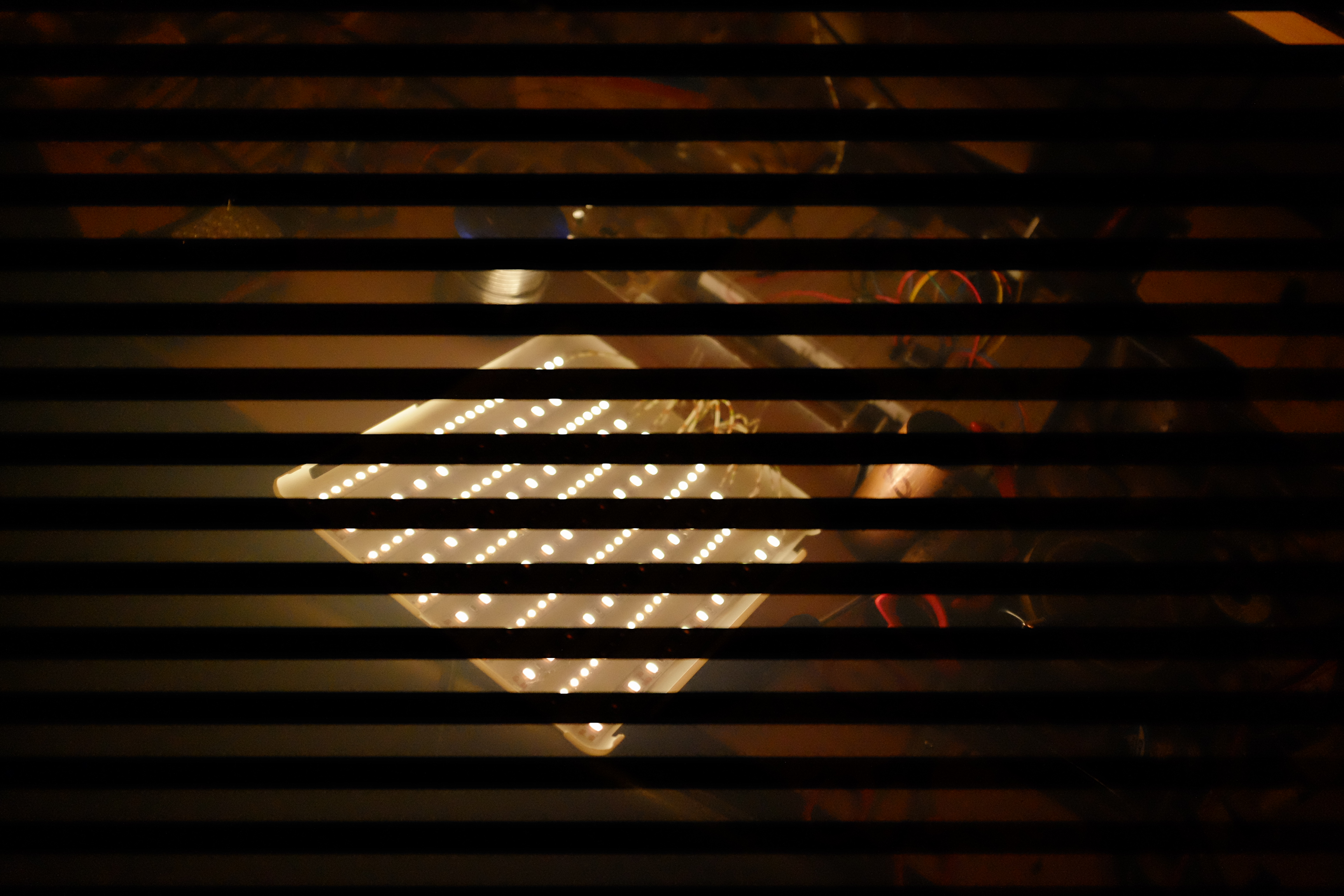 Out of focus and poorly framed, a thousand apologies – but we can still draw conclusions: flashing at 100 Hz, we see six visible bands of illumination and can deduce that there was a seventh at the bottom of the frame (but since there was no light there, we see nothing – a thousand more apologies).